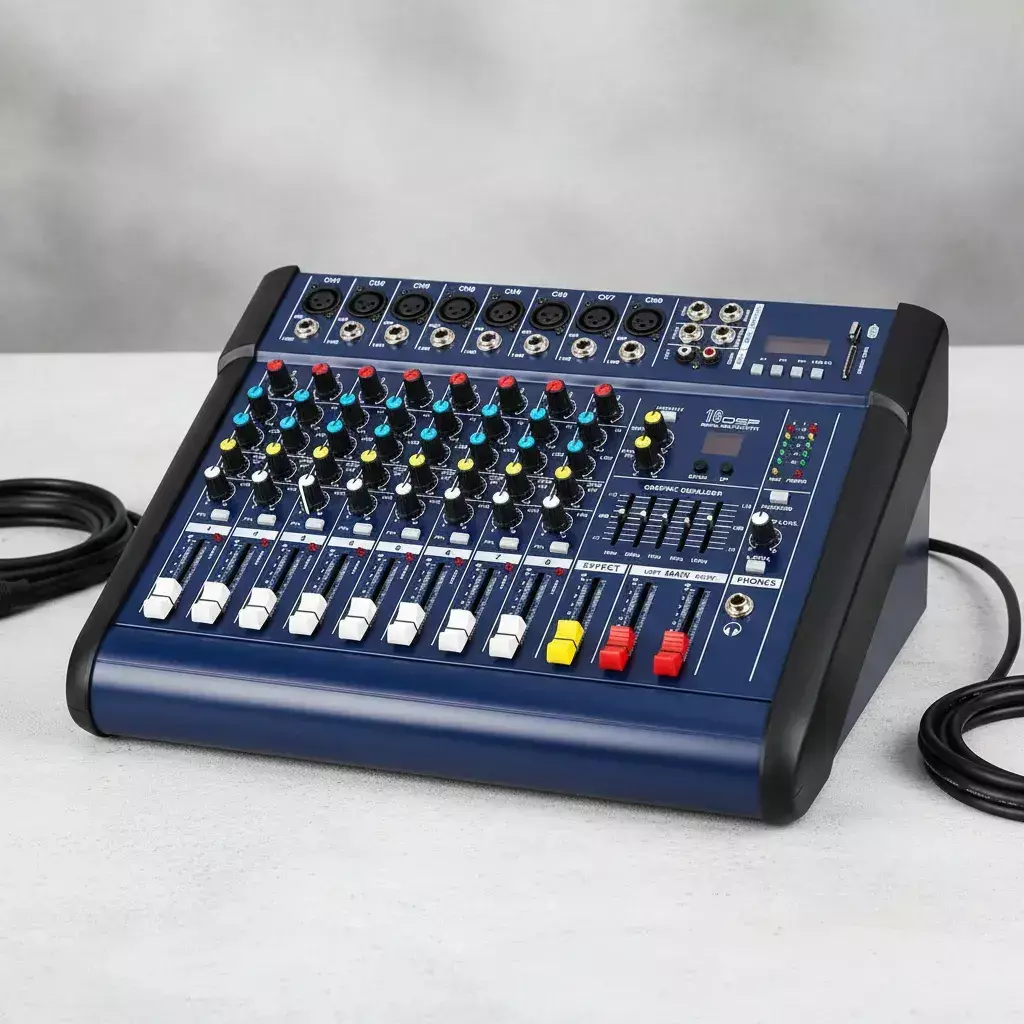 Consola Mixer Profesional 4, 6 u 8 Canales – Ultra Low Noise Ideal para estudios, iglesias, bares, bandas en vivo o DJs. Ofrece preamplificadores de micrófono de alta calidad con alimentación phantom, entradas balanceadas y múltiples efectos, todo en un equipo confiable y versátil. Características principales: 4, 6 u 8 canales mono de entrada con conectores XLR bañados en oro y entradas de línea balanceadas Preamplificadores de micrófono ultra low noise con +48V Phantom Power Entradas balanceadas para máxima integridad de señal Ecualización musical de 2 bandas en todos los canales Indicadores LED de pico en cada canal mono 1 envío Auxiliar por canal para efectos externos y monitoreo 16 efectos de eco integrados (simulate effect) Salida Master Mix y salida de grabación Medidores Bargraph de 5 segmentos de alta precisión Salidas Master Mix independientes Reproductor USB/SD con display Especificaciones técnicas Entradas Mono (Mic/Line): Electrónicamente balanceadas Respuesta en frecuencia: 10 Hz – 60 kHz ±3 dB Distorsión (THD+N): 0.01% @ +4dBu, 1 kHz (BW 80 kHz) Rango de Trim: +10 dB a 60 dB Rango de nivel de línea: +10 dBu a 4 dBu Ecualización: High Shelving: 12 kHz ±15 dB Mid: 2.5 kHz ±15 dB Low Shelving: 80 Hz ±15 dB Master Mix: Salida balanceada: +22 dBu Aux Send máx. out: +22 dBu no balanceada Control Room out: +22 dBu no balanceada Relación señal/ruido: +112 dB (todas las entradas en Unity Gain) Alimentación eléctrica: 120V AC 60Hz 220V AC 50Hz 240V AC 50Hz Beneficios Sonido limpio y profesional con muy bajo nivel de ruido Ideal para grabación, streaming o sonido en vivo Compacta, versátil y confiable Conexión directa de micrófonos, instrumentos y reproductores Lista para usarse en cualquier aplicación de audio profesional.